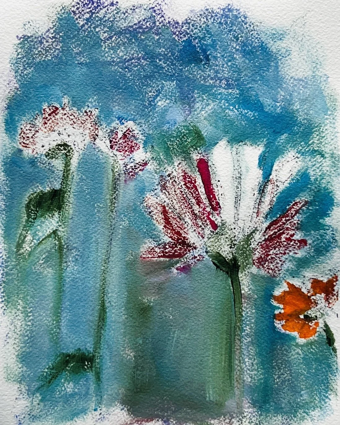 Red Zinnias, 2025. Mixed media on paper, 11" x 13" $250.00